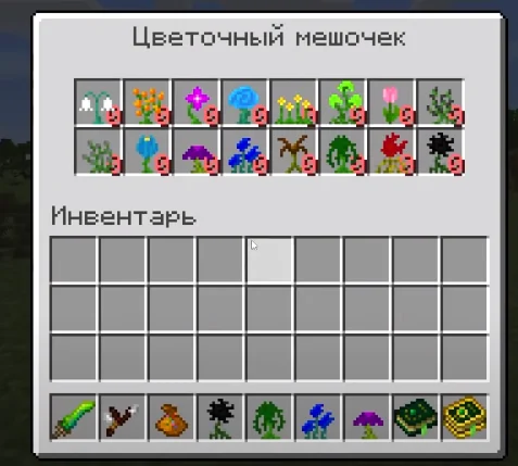 Вот вы сделали много удобрений, и собрали бесконечное множество цветов, куда же их девать? – спросите вы. Именно для этого разработчики создали «цветочный мешочек», в который можно положить до стака (64 штуки) одного вида существующего цветка. Он делается из пяти шерсти любого цвета, и из одного лепестка или гриба.