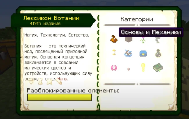 Теперь давайте перейдет к основам этого дополнения. В первую очередь я вам советую создать специальную книгу «Лексикон ботании», она делается из любого саженца ванильного дерева, а также с помощью обычной книги, ничего сложного. Когда вы откроете эту книгу, практически все разделы будут заблокированы, за исключением вкладки «основы и механики», и в нем также не будут показаны все изучения, которые доступны. Как вы поняли, в этой книге написано абсолютно всё, что будет необходимо в выживании, а заблокированные вкладки будут доступны по мере прохождения.