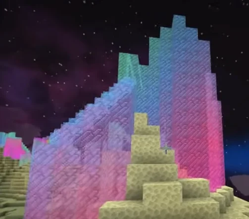 У этих пещер есть одна особенность, практически всегда над ними появляются горы Авроры, которые состоят из горных кристаллов. Это выглядит просто потрясающе. Горные кристаллы можно добыть с помощью железной кирки и выше, тогда вы получите с них кусочки кристалла, которые можно будет соединить обратно в блоки.