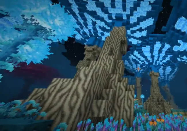 И последний биом модификации, на который мы сегодня посмотрим – это туманный грибной лес. Выглядит по-настоящему внушающе, когда вы будете в него заходить, видимость будет резко сужаться, это связано с плотным туманом, как несложно догадаться по названию. Деревья в этом биоме очень громадные, представлены они в виде грибов, их шляпки излучают яркий и приятный для глаз голубой свет. Обратите внимание, что из новых досок можно создавать такие же декоративные блоки по меркам ванильной игры. Среди наземной растительности выступают новые виды мха, травы и растений. Из растительности можно создать красители и новую световую лампу.
