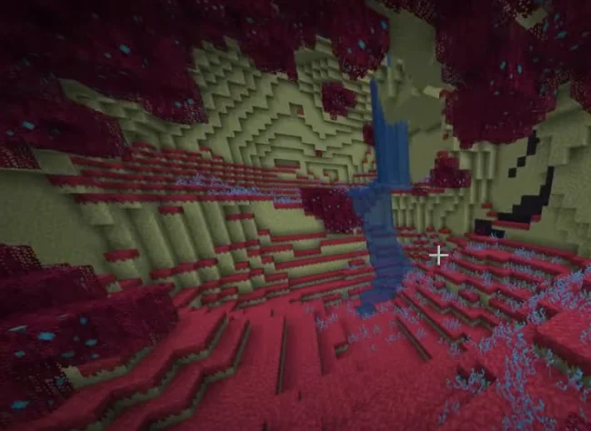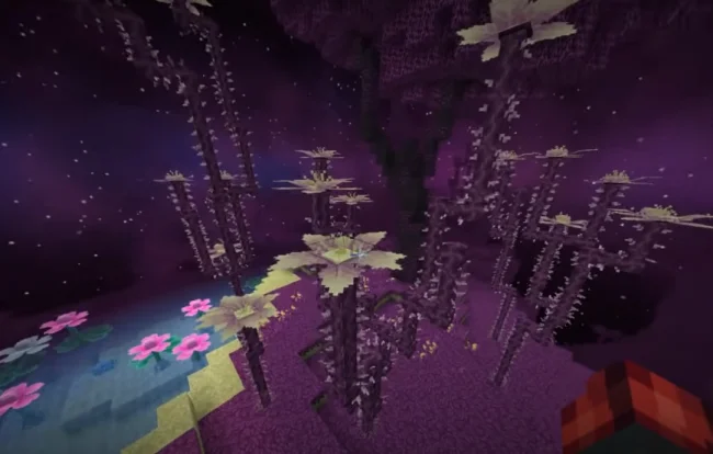 С пустоши и озёр мы переходим плавно к другим биомам. Следующее место – пещеры эндера. Здесь нет ничего особенного, просто просторные подземелья, в которых растет красный мох и виолецит. С помощью виолецита можно создавать декоративные блоки по стандартам ванильной игры (плиты, ступеньки, полублоки, заборы и так далее).