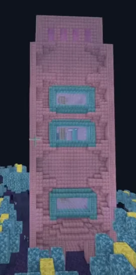 Помимо маленьких башен встречаются и более высокие (все башни разного размера принято считать как один и тот же данж). На первом этаже почти ничего не изменилось, исключая то, что фиолетовое стекло заменили на голубое. Поднявшись чуть выше, вы заметите четыре местных гигантских цветка, которые будут произрастать в соответствующих горшках. Третий этаж будет оснащен красивым гладким эндерняком, а также нектаром гигантских цветов. Верхушка у всех башен абсолютно одинакова, никаких отличий у них нет.