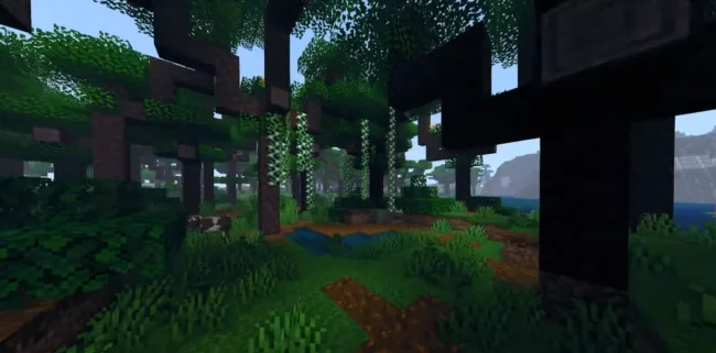 С этого биома ваш игровой персонаж может получить большое количество единиц кувшинок и замшелый булыжник. А также, вы можете наткнуться на новое растение под названием «Обезьянья кисть», которое имеет четыре разных вида (отличаются они только по цвету). Обезьянья кисть может расти как на боковых, так и на верхних и нижних частях блока. Немалая часть этого биома состоит из палисандра, о котором шла речь ранее. С этого дерева вы можете получить саженец для будущего выращивания, а также доски, из которых можно создать стандартный набор блоков (полублоки, ступеньки, люки, заборы, сундуки и так далее). Здесь также можно встретить интересную растительность – пассифлора, которая напоминает своим внешним видом ванильную лозу, с нее вы можете собирать маракую, нажатием правой кнопкой мыши.