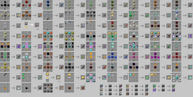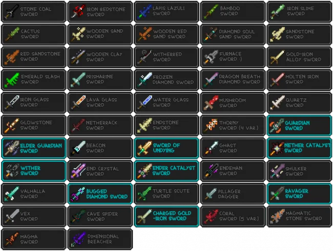 На данный момент в модификации присутствует около 50-ти новых видов мечей, которые имеют свою модель, анимацию и особенности. Это разнообразит ваш скучный арсенал оружия! Хочу заметить, что крафт данных мечей состоит из уже ванильных предметов и блоков, это добавляет полезности тем или иным ресурсам.