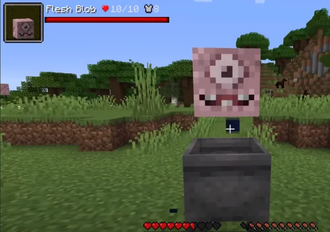 Теперь остается только ждать, со временем, если вам повезет, плоть станет оживать, и, в итоге, мы получим одноглазого монстра, который будет враждебно настроен против вашего игрового персонажа. Он имеет 10 единиц здоровья (5 сердец), а также 8 единиц защиты (4 брони). Наносит это чудище ни много ни мало, 4 единицы урона за один раз. После смерти с него выпадает небольшое количество сфер опыта в виде двух единиц, а также самое главное - блок плоти.