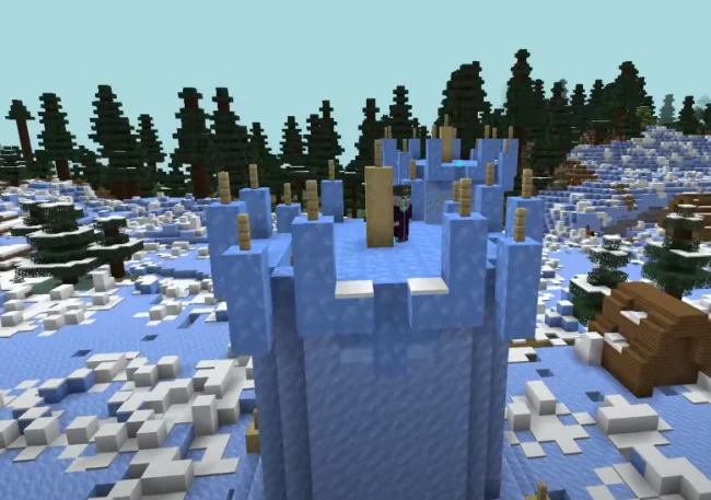 - Вторая структура – снежная башня, она состоит из большого количество льда, снега, а также имеет свои хранилища. В них можно найти много полезных вещей, которые помогут вашему игровому персонажу в дальнейшем развитии в этом кубическом мире. Однако вы могли подумать, что все слишком подозрительно просто, ведь такие полезные для игрока структуры, должны быть под охраной. И вы будете правы! Помимо полезных блоков и сундуков, здесь появляется главный босс данной модификации – снежный волшебник. Он также имеет свою шкалу запаса здоровья, которая будет постепенно снижаться при получении им урона. После его смерти выпадает небольшое количество опыта, а также артефакт, который в будущем вам пригодится.