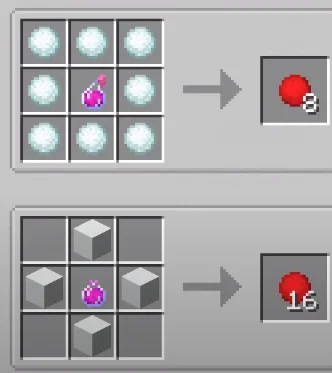 В моде есть два вида рецептов крафта, путем которых вы сможете получить новый «огнестрел». Восемь снежков с эффектом создаются с помощью аналогичного количества обычных снежков, а по центру зелье, эффект которого будет соединен с ними. Можно получить 16 снежков, просто добавьте четыре блока снега, вместо восьми снежков.