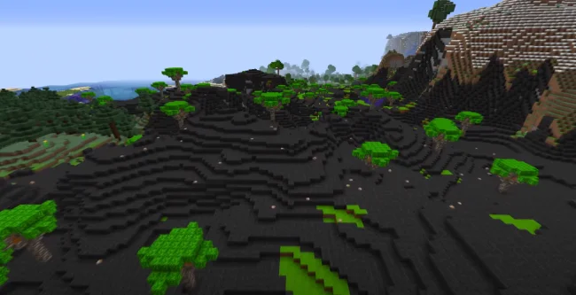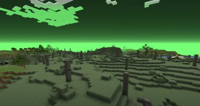 - Следующий биом – долины проклятых. Это место не назовешь дружелюбным и красивым биомом, да и в целом про него нечего рассказывать. Голые деревья, мрачный переработанный дёрн и небо, встречается очень мало водоёмов, просто зеленая пустыня.