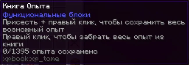 Теперь, держа ее в руке, при нажатии Shift + ПКМ книга заберет в себя весь возможный опыт игрока. Максимальная ее вместимость 1395 единиц опыта, что равно 30 уровням. Чтобы забрать опыт обратно, нужно просто нажать ПКМ, держа ее в руке.