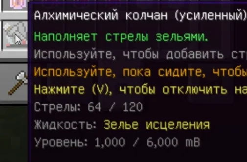 Полезные инструменты, которые способны накладывать на стрелы эффекты зелий. Для этого нужно в него набрать жидкость или зелье, так же как и в шприц. Для начала нужно включить режим наполнения кнопкой V. Далее с помощью нажатия ПКМ колчаном все стрелы в инвентаре добавятся в колчан. При стрельбе из лука или арбалета стрелы будут иметь эффект зелья из данного колчана. Разные виды колчанов имеют разную вместимость стрел и количества зелья.