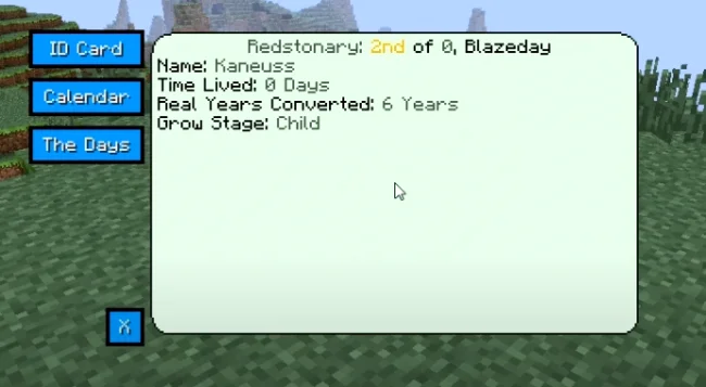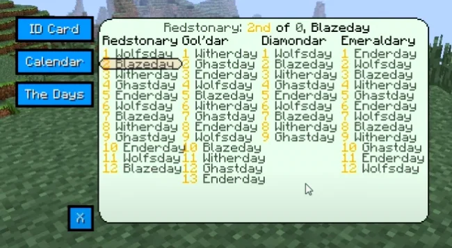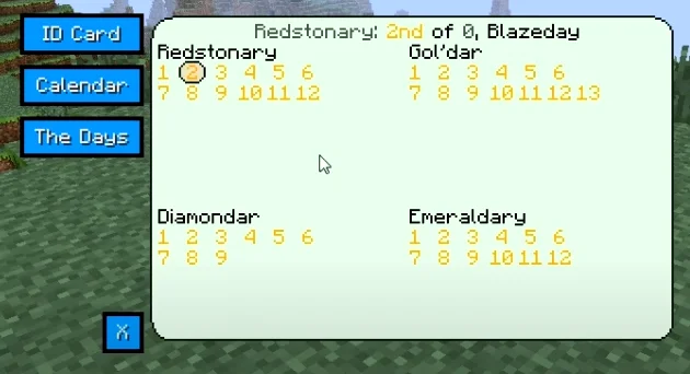 Тут мы видим всего четыре месяца: «Redstonary», в нем всего 12 дней, «Gol`dar», целых 13 дней, «Diamondar», всего 9 дней, «Emeraldary», также 12 дней. Переключаемся на последнюю вкладку, где написано «Days», там будут перечислены все дни. После того как закончатся все месяцы и дни, у вас будет написано «of 1» (в первой вкладке, «ID Card»), вместо «of 0».