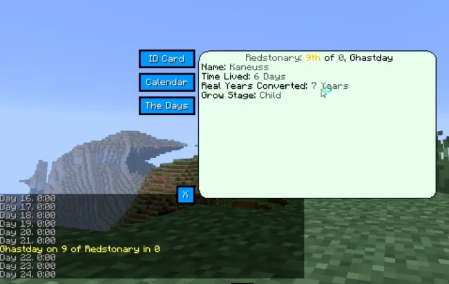 Проведем опыт, возьмем вспомогательный мод на смену дня и ночи, затем переключим несколько раз день и ночь. Получаем уведомления в чате о том, что числа и месяцы изменялись. Открываем статистику и видим, что игровому персонажу исполнилось уже семь лет, а было, в свою очередь, всего шесть.