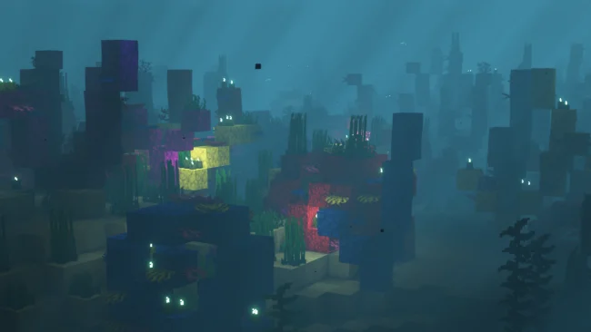 - Свет в воде - несколько красивых эффектов, без которых нет ни одних шейдеров. Эти шейдеры будут делать поверхность воды немного более неровной, но по сравнению с другими шейдерами, этот эффект заметен не очень сильно. Под водой пользователь сможет заметить, что все стало намного мутнее и темнее. Кажется, будто вода грязная или на поверхности ночь. Из-за этого эффекта исследование океанов и морей будет немного сложнее, но игрок сможет сделать воду более прозрачной в настройках шейдеров. Еще интересным изменением будет то, что лучи Солнца можно отчетливо увидеть под водой.