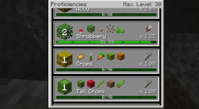 С помощью мода Proficiency: Honest Work игроки могут развивать свои навыки в различных профессиях, таких как добыча определенных блоков или руд, фермерство, ремесло, охота, убийство врагов, рыбалка, сбор разных растений и другие. Каждая профессия имеет свою собственную систему уровней, отображающую прогресс игрока в данной области. С повышением уровня в профессии открываются новые навыки, улучшения и возможности для игрока. Максимальный уровень прокачки любой деятельности равен тридцати, из-за чего игроку для этого потребуется долго выживать. Все навыки будут улучшаться по мере прохождения игры, поэтому можно не тратить время только для повышения характеристик.
