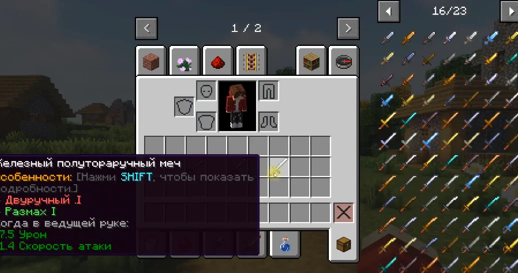 Spartan Weaponry впечатляет своим арсеналом. Мечи стали более разнообразными: короткие клинки для быстрой атаки, длинные для нанесения мощного урона, а двуручные мечи идеально подходят для борьбы с группами врагов. Копья позволяют держать дистанцию, эффективны против высоких мобов и даже в PvP. Арбалеты и луки с модификациями обеспечивают возможность поражать цели на расстоянии, а кинжалы и маленькие мечи позволяют устраивать скрытые атаки и быстрые перестрелки. Такое разнообразие делает бой в Майнкрафт более многогранным и увлекательным, ведь теперь каждый стиль игры можно подобрать под себя.
