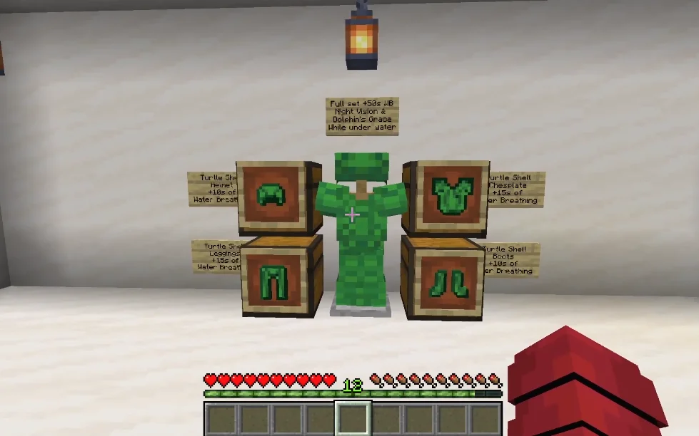 Главная особенность брони черепахи — её исключительная прочность. Она способна выдерживать мощные атаки и сохраняет игроку жизнь даже в самых опасных ситуациях. Полный комплект обеспечивает значительное повышение здоровья и устойчивость к физическому урону. Кроме того, эта броня даёт игроку возможность дольше находиться под водой без потери дыхания, что делает подводные исследования значительно безопаснее. В сочетании с зельями или другими модами, усиливающими подводное передвижение, броня открывает новые горизонты для морских приключений.