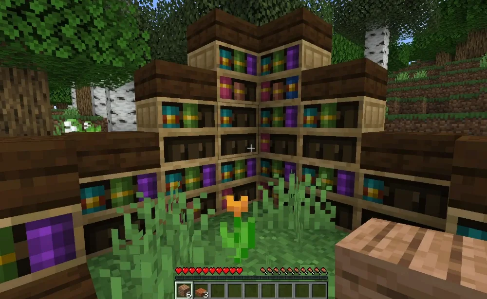 Главная особенность Variant Chiseled Bookshelves заключается в том, что он добавляет полноценные резные книжные полки из каждого вида древесины. Это позволяет игрокам использовать дуб, берёзу, ель, акацию, тёмный дуб, мангровое дерево, а также древесину из Нижнего мира для создания уникальных декоративных конструкций. Каждая полка имеет собственную цветовую палитру и текстуру, благодаря чему здания выглядят завершёнными и стильными. Такое разнообразие особенно полезно для тех, кто любит продумывать оформление домов и создавать атмосферные комнаты.