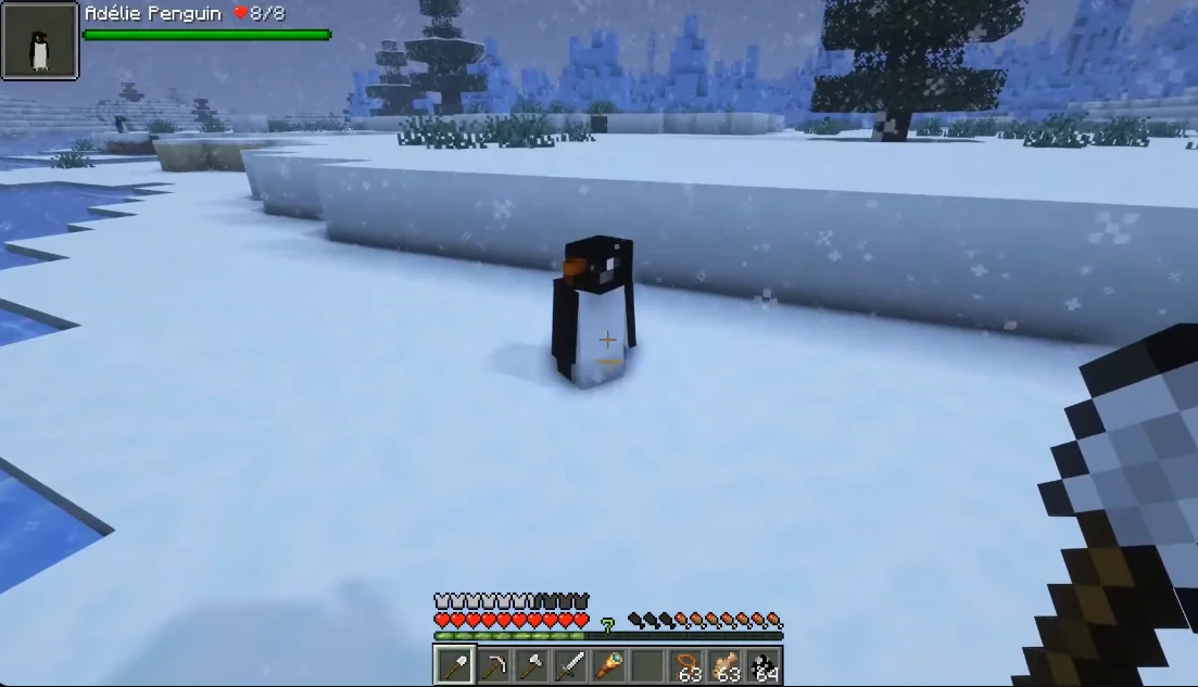 Главной особенностью Waddles являются пингвины Адели, тщательно проработанные с точки зрения анимаций и искусственного интеллекта. Они передвигаются характерной походкой, скользят по льду и активно взаимодействуют друг с другом. Пингвины могут собираться в небольшие группы, создавая ощущение колонии, что усиливает эффект живого мира. Их поведение выглядит естественно и не нарушает баланс игры, а наоборот, дополняет ванильную экосистему снежных биомов.