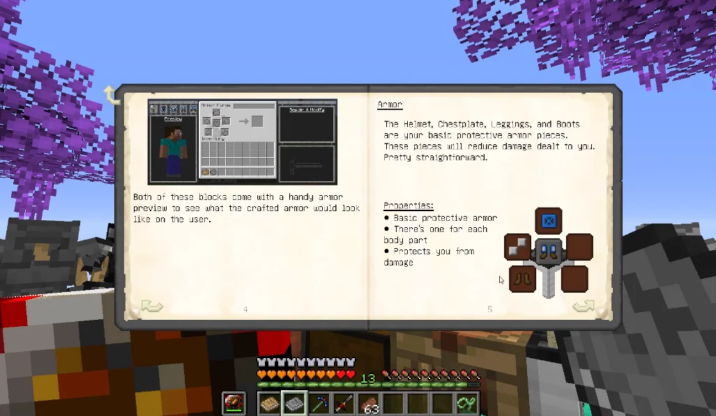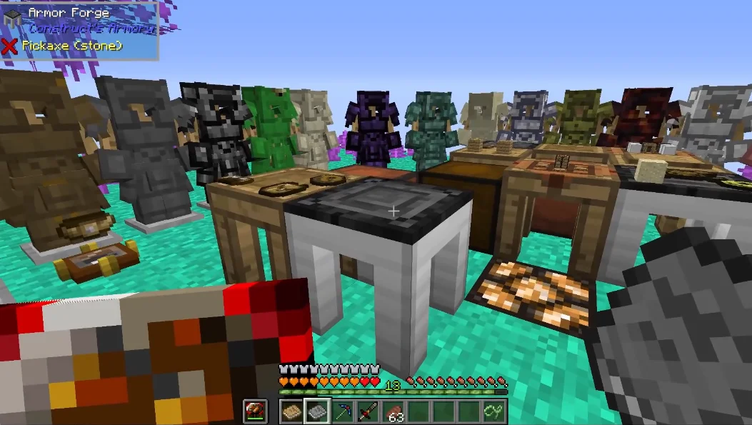 Все элементы брони используют материалы из Tinkers Construct, включая металлы, сплавы и редкие ресурсы. Выбор материала напрямую влияет на характеристики: одни увеличивают защиту, другие дают бонусы к мобильности или выносливости. Помимо этого, броню можно улучшать с помощью модификаторов, добавляя специальные эффекты, сопротивление урону или вспомогательные свойства. Система улучшений мотивирует исследовать мир и активно использовать ресурсы, а не ограничиваться одним оптимальным набором.