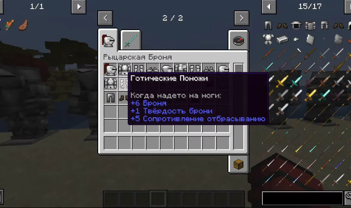 Одной из ключевых особенностей мода является огромное количество новых комплектов брони. Каждый доспех имеет уникальный внешний вид и подчёркивает определённый стиль эпохи. Броня выглядит массивно, детализированно и значительно отличается от ванильных сетов. Она отлично подходит для ролевых миров, сюжетных серверов и одиночных прохождений с упором на атмосферу. Доспехи не просто защищают персонажа, а формируют его образ и статус в мире.